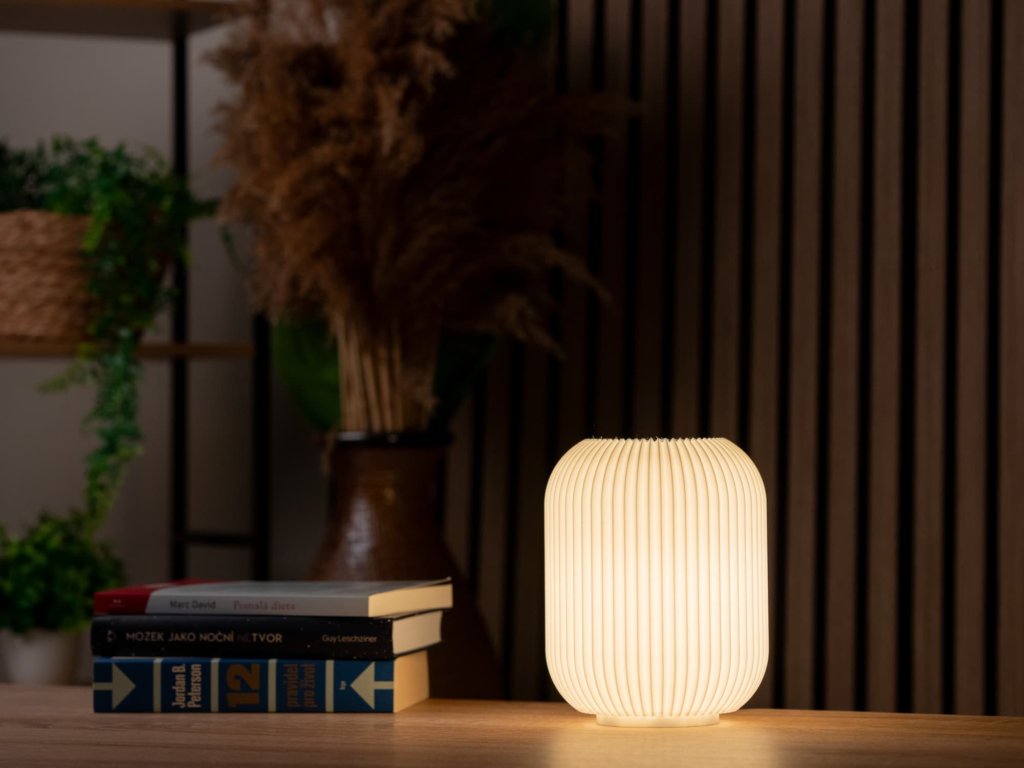 Stolní lampa Clara přináší minimalistický a moderní design, který se skvěle hodí do jakéhokoliv interiéru. Bílé stínidlo s jemným vroubkováním příjemně rozptyluje světlo a vytváří klidnou atmosféru. Je vyrobeno pomocí 3D tisku vrstvu po vrstvě, což mu dodává jeho jedinečný tvar. Lampa je doplněna nenápadným podstavcem, který umožní stínidlu dokonale vyniknout.