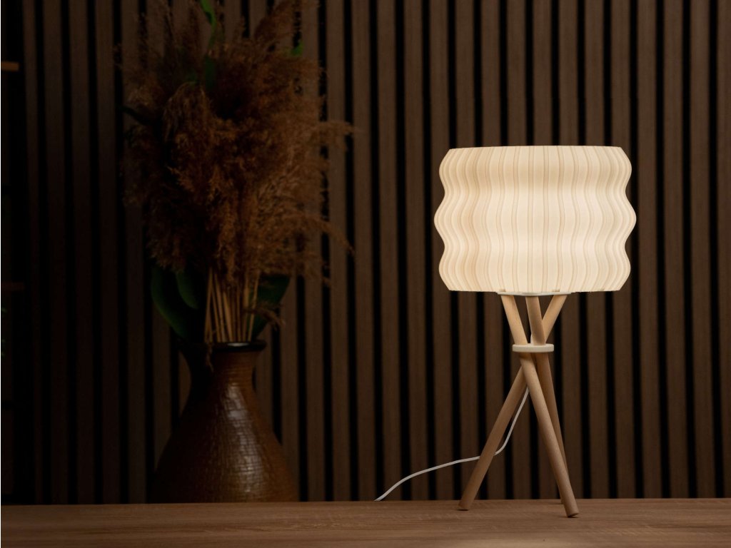 Stolní lampa Lucia přináší elegantní a moderní design, který krásně rozzáří Váš interiér. Bílé stínidlo s jemnými vlnkami a vroubkováním příjemně rozptyluje světlo a vytváří klidnou atmosféru. Je vyrobeno pomocí 3D tisku vrstvu po vrstvě, což mu dodává jeho jedinečný tvar. Unikátní vzhled a stabilitu produktu dodává trojnožka z bukového dřeva, která harmonicky ladí k tónům bílého stínidla.